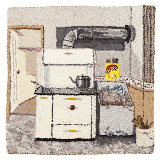 When I first saw Joanna’s piece titled “Kitchen”, I thought if I waited long enough I would see a woman come through the door and start working at the stove. The details and the shadows are very well done and I can’t really see the loops so it made me wonder if Joanna was using a fine cut and also what material she was using.