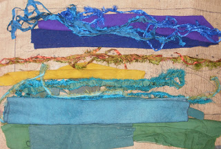 So basically to colour plan I just keep throwing different wool pieces down on the burlap and see what works. I did end up changing the colour of the sky to gray as thought it was looking a bit too cheerful.