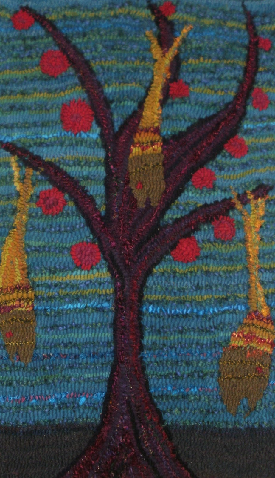 Just finished this rug! I was initially thinking of hooking a fish tree, but it looked rather bare so needed to add some apples to zip it up a bit. …but may still do a fish tree. Yes!, fish is very much on my brain…stay tuned for “Lady Walking Fish”.